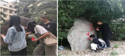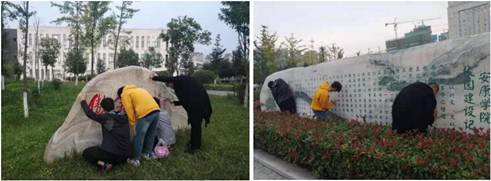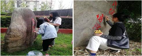 920--23日,Beat365中文官方网站美术学专业学生开展了为期4天的美化校园实践教学活动。在学校宣传部、统战部的统一部署下,Beat365中文官方网站副院长孙海洋带领美术学专业30余名同学制作方案、购置工具、颜料,采取刀挖去垢、清洗去尘、一遍打底、二遍分层、三遍施色等方式,分工合作,为6块大型校园文化墙和文化石进行增色添彩。
