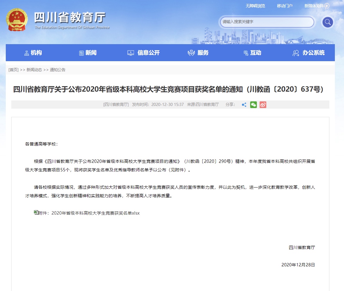 12月31日,2020年四川省大学生原创动漫大赛评审结果在四川省教育厅和四川省本科高校竞赛平台官网上陆续公布,Beat365官网学生取得佳绩,获得一等奖1项、二等奖2项、三等奖9项,南京、刘婉毅获得“优秀指导老师”。