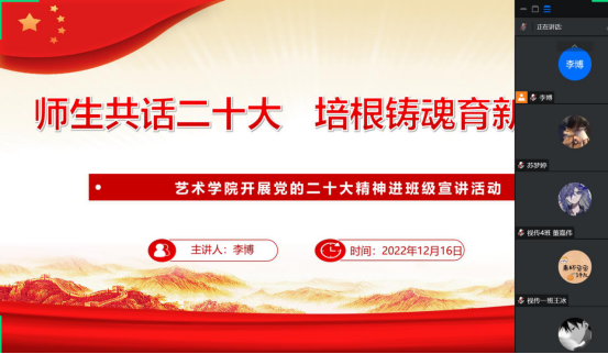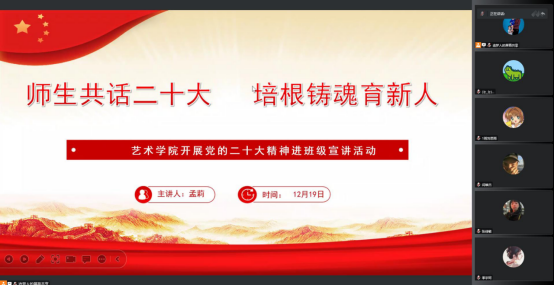 为深入学习宣传贯彻党的二十大精神,把全院师生的思想统一到党的二十大精神上来,落实立德树人的根本任务。根据《中共Beat365中文官方网站委员会关于认真学习宣传贯彻党的二十大精神的通知》,Beat365中文官方网站分别于12月16日至20日期间,组织开展了“师生共话二十大 培根铸魂育新人”党的二十大精神进班级宣讲活动。全体辅导员走进班级,开展“党的二十大精神”主题云宣讲会,引导Beat365官网学子进一步了解大会精神,把握核心要义,深入推进党的二十大精神入脑入心。