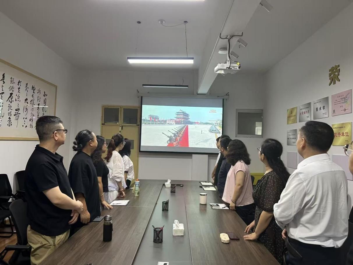 上午9时,活动在庄严的国歌声中拉开序幕。党总支书记张慧强调:九三阅兵是铭记历史、弘扬爱国主义精神的重要契机,全体教职工需将爱国情怀融入艺术教育实践。随后,全体人员集中观看九三阅兵直播,感受国防力量的磅礴气势。直播中,受阅官兵整齐划一的步伐、先进精良的国防装备,引发强烈共鸣,现场多次响起热烈掌声,激发了在场师生的强烈民族自豪感。