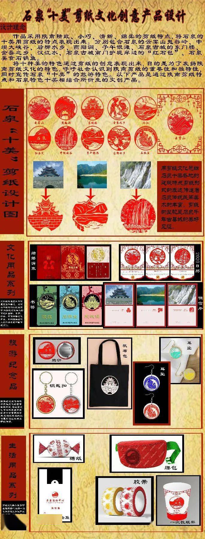 设计说明:作品通过采用精致、小巧、清新、绵柔的陕南剪纸,将石泉十美的特点表现出来。设计中涵盖了石泉的云雾山鬼谷岭、中坝大峡谷、后柳水乡、燕翔洞、子午银滩、石泉古城东门楼、金蚕之乡、汉江水、石泉古城南门红石包、石泉食美石锅鱼等旅游文化要素。将十美通过创意剪纸表现出来,既有利于弘扬陕南剪纸文化,又有利于宣传石泉十美的旅游特色。