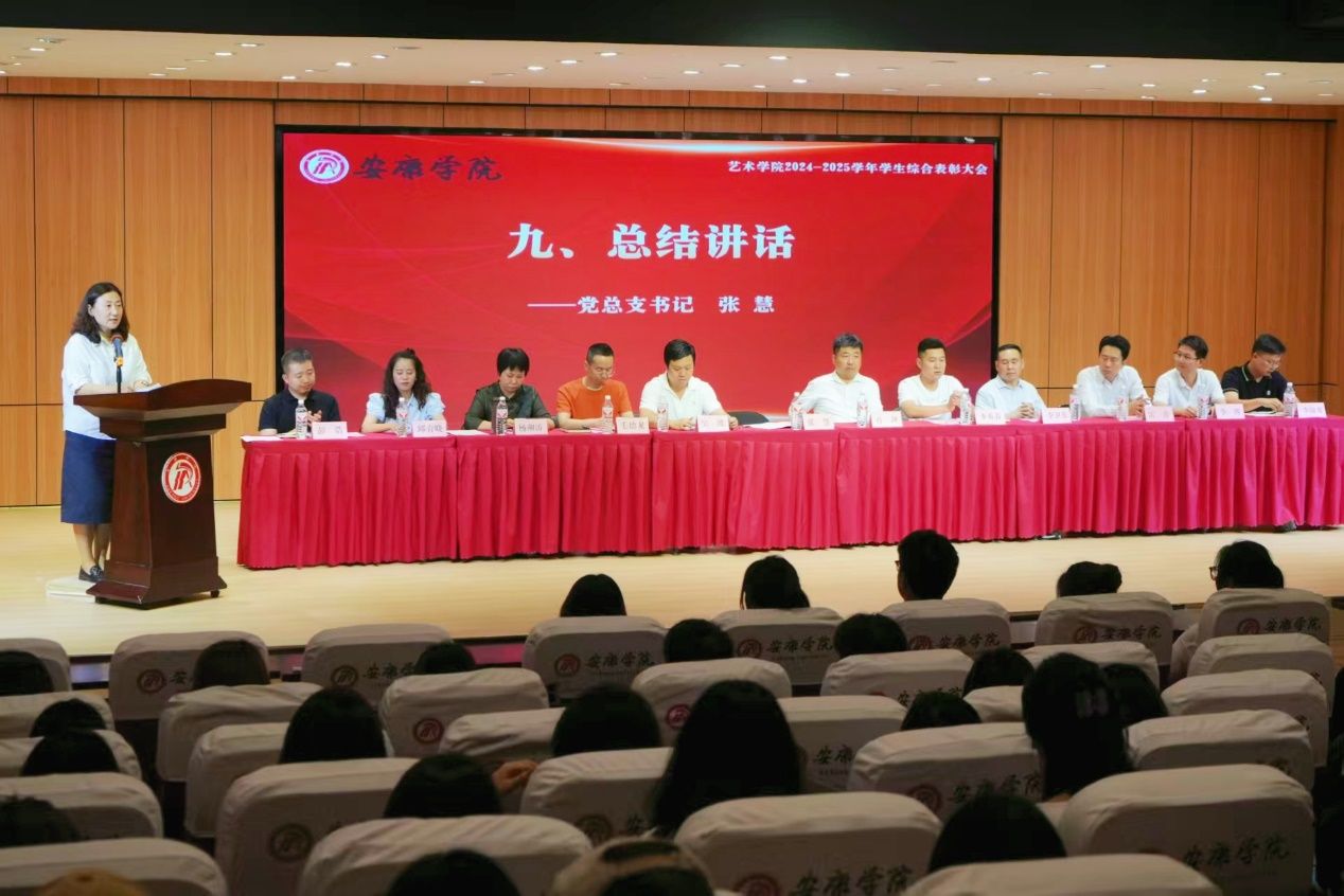 党总支书记张慧在总结讲话中代表学院向所有受表彰的学生表示热烈祝贺,她充分肯定了过去一学年中全院学生在专业技能学习、体育运动竞赛、学科竞赛创新以及校园文化建设等方面取得的优异成绩与积极贡献,对他们取得的成绩给予高度评价。她勉励广大学子要坚定政治方向,厚植家国情怀,让艺术创作扎根时代沃土;要深耕专业素养,勇于探索创新,以匠心精神攀登艺术高峰;要践行社会责任,弘扬奉献精神,用艺术力量服务社会大众。同时,希望全院全体同学以受表彰的同学为榜样,坚定理想信念,锤炼过硬本领,勇担时代使命,用青春与才华书写属于自己的精彩篇章,为学院发展、为文化繁荣做出更大的贡献!