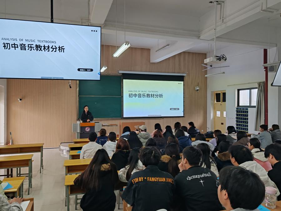 刘老师以《初中音乐教材分析》为题,拉开了此次课程的序幕。课堂上,刘老师凭借多年深耕一线教学积累的丰富经验,对初中音乐教材的结构体系和内容编排逻辑进行了细致入微的剖析。她深入解读了教材中各单元主题的设计初衷,以及如何巧妙运用多样化的教学活动,将教材中的知识转化为生动有趣、引人入胜的课堂内容,让学生们对初中音乐教学有了全新的认识。