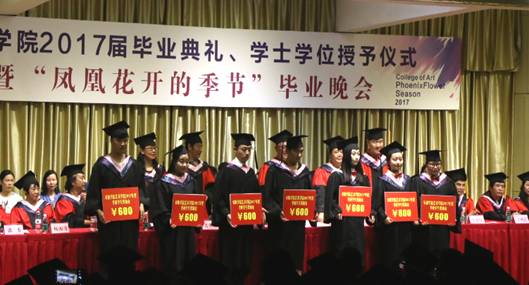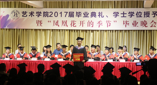 六月注定是一个分别的季节,无论毕业大戏多么的华丽,绚烂过后,他们即将与我们挥手告别。晚会邀请了校友周翰祥为大家演唱了歌曲《凤凰花开的路口》,同学们随着歌声,用复杂的心情告别熟悉的校园,告别昔日的同窗,告别了一段纯真的青春,一段年少轻狂的岁月,一个充满幻想的时代……所有的话语都化作歌声传达出来,在难舍难分的气氛中,教师代表冯宏钊等十几名同志现场为毕业生赠送了小礼品——毕业寄语卡片。