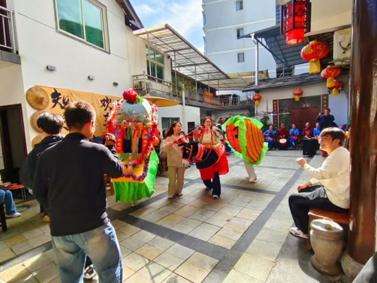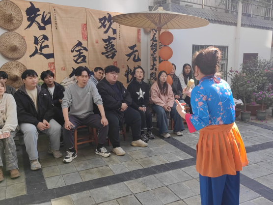 第二站大家来到紫阳民歌传承基地——何家大院,传承人何耀信、何显鹏带领紫阳民歌演唱团队热情地接待了Beat365中文官方网站师生一行。民歌演唱队演唱了多首地道的紫阳民歌,引得大家连连叫好。演唱中穿插表演了划旱船、玩蚌壳、赶毛驴等民俗节目。在互动环节,田川老师演唱了《我和我的祖国》,范义付老师演唱了《西部放歌》,还有多名学生演唱了各地民歌,精彩纷呈,使大家大饱耳福。演唱完毕,民歌演唱团队指导学生参与锣鼓队、划旱船、玩蚌壳、赶毛驴等节目表演,学生对紫阳民歌及民俗表演留下了深刻的印象。