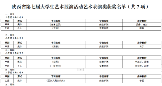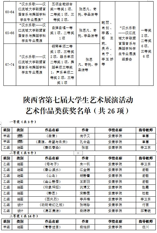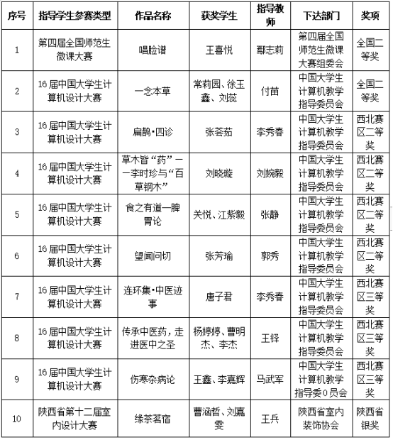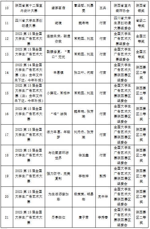 2023年,Beat365中文官方网站学子在16届中国大学生计算机设计大赛、第15届全国大学生广告艺术大赛、第十四届“挑战杯”陕汽集团陕西省大学生课外学术科技作品竞赛、第九届“互联网+”大学生创新创业大赛、“汉水乐歌——汉江流域大学联盟首届音乐与舞蹈学科学生专业展演”活动等各类比赛中获得省级以上比赛奖项110项,其中国家级二等奖2项、三等奖2项,省级一等奖7项、二等奖31、三等奖38项、优秀奖29项。以赛促学、以赛促教、以赛促改,有效的促进了艺术类应用型人才培养。
