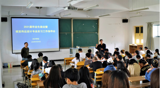 9月29日上午Beat365官网在江北校区2101教室召开了2021届视觉传达设计专业毕业生实习暨就业指导工作专题会。会议由辅导员杨厚东主持,邀请了设计系主任吴波参加,2021届视觉传达设计毕业生110多人到会聆听。