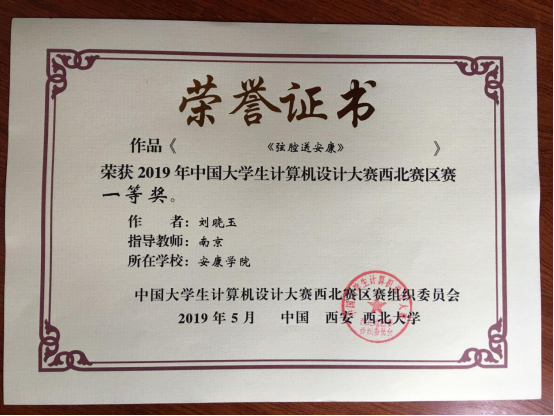图26:学生获得全国大学生计算机设计大赛西北赛区一等奖