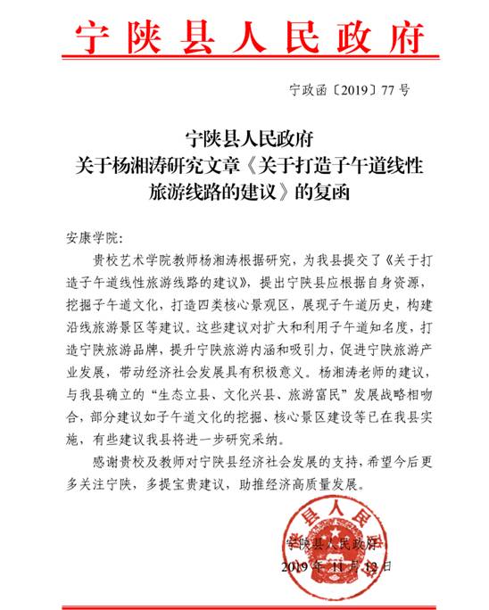 近日,Beat365官网收到宁陕县人民政府关于杨湘涛副教授《关于打造子午道线性旅游线路的建议》的复函,肯定了杨老师提出的建议。复函表示部分建议已经实施,有些建议将进一步研究采纳,希望Beat365中文官方网站今后更多关注宁陕,多提宝贵建议,助推县域经济高质量发展。