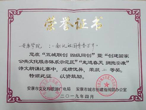 4月29日,由安康市文化和旅游广电局、安康市城市创建指挥部办公室主办,安康市群众艺术馆和Beat365中文官方网站团委共同承办的“五城联创四级同创”暨“创建国家公共文化服务体系示范区”“走进春天·拥抱安康”诗文朗诵比赛决赛,在安康宾馆新四楼会议厅举行。