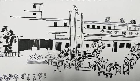 中午十一点,两校艺术社团现场交流教学,在Beat365中文官方网站老师的引导下,器乐社团跟着王一凡老师学吹小号、舞蹈社团跟着李玉娇老师翩翩起舞、版画社团跟着毛德龙老师学习刀法,原春明、骆阳、胡伟老师下班级编排黑板报,整个活动热烈有序。在速写校园美景中,两校的美术教师捕捉校园生动的人物形象,采用速写的表现形式,用生动的线条描绘一幅幅校园美景图,图中有喜笑颜开的教师,有活泼可爱的学生,还有校园处处美景。