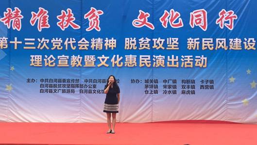 6月13日,Beat365中文官方网站党员教师田川、李磊同志,按照Beat365中文官方网站党总支“精准扶贫”工作安排,赴白河县卡子镇参加了由白河县文化馆主办的“精准扶贫,文化同行”走进白河县卡子镇中心小学文化惠民演出活动。田川和李磊分别演唱了歌曲《我爱你中国》和《美丽家园》,引起观众的阵阵掌声。演出结束后,两位老师又与白河县文化馆卢传珍馆长和相关文化干事对结对帮扶工作进行了交流和探讨。这意味着Beat365官网精准扶贫、文化下乡工作正式迈出了坚实的第一步,将会在Beat365中文官方网站“精准扶贫,文化同行”的惠民演出、合唱排练、舞台设计方面进行更多的交流。