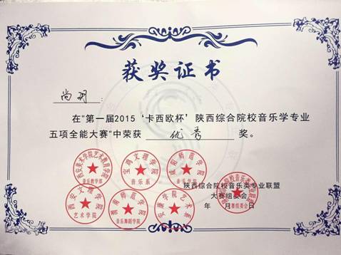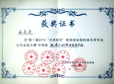 本次比赛项目分为:钢琴演奏、歌唱与钢琴伴奏、自弹自唱、综合音乐知识及自选项目,分别设五项全能奖和各比赛单项奖。经过激烈角逐,我系2012级学生蒋亮亮获得“歌唱与伴奏”单项奖、 2013级学生尚玥、2014级学生李婷获得“优秀奖”。