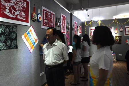2015年7月1日,上午11点 陕南民间美术课程汇报展开幕仪式在江北艺术楼隆重举行。安康市委宣传部原副部长马昌琪、系主任单福东、副主任雷升录、教研室主任孙海洋、吴波以及各位专业老师参加了仪式。展览开幕式由郭秀老师主持,系副主任雷升录致开幕词,对陕南民间美术做了系统的阐述,并指出其重要地位和独特性,鼓励大家吸取传统文化的精华;郭秀老师对本次展览做了简要的介绍;最后系主任单福东宣布展览开幕。