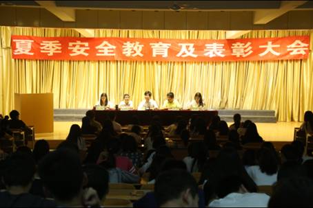 系党总支书记冯丰收首先从近期校内外发生的安全事故讲起,对夏季安全工作作了要求,他希望同学们要珍惜生命,禁止下江河、池塘游泳、防止雷击、洪水事件的发生。放假时期注意防抢、防盗、防骗、放食物中毒、中暑等,女生要注意着装,防止性侵犯,注意交通安全,杜绝打架斗殴、醺酒事件的发生。