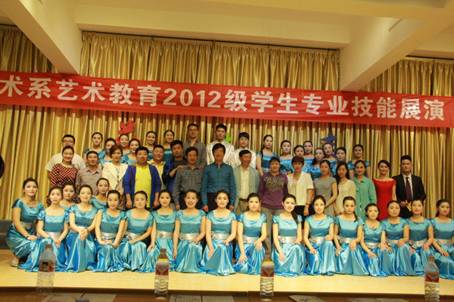 2015年5月17日晚20:00,艺术教育2012级学生“艺青春”专业技能展演在江北校区1401演艺厅拉开帷幕。本次展演以追忆青春、回首大学三年的时光作为初衷,由刘泽桢、田川老师作为总策划人,班团干部精心组织同学们积极参与,全班35名同学凝神聚力成功举办了这次展演活动。应邀观看展演活动的有系党总支书记冯丰收、系副主任雷升录、系办公室主任肖剑、艺术教育专业课老师等二百余名师生;同时还特邀了安康市儿童福利院领导、老师光临晚会现场。