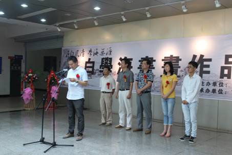 开幕仪式上,首先由孙海洋主任对本次书画展以及白学海个人做了简要介绍;接着艺术系党总支书记冯丰收为白学海同学书画展热情致辞。他从勤奋、刻苦、真诚三个方面给予了白学海同学高度的赞扬。他说:白学海同学参加过许许多多比赛并获奖,一个大三的学生能拿出这么多幅作品在市级的展览馆展出,这种精神我们其他同学应该学习,本次展览以临摹和写生为主,以后的学习中应该加大创作力度。最后祝愿白学海同学在艺术道路上越走越远。开幕式最后群艺馆馆长周墙宣布“月白风清,学海无涯”白学海书画作品展开幕。