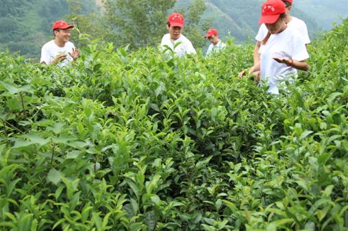 紫阳县素有茶乡之称,茶叶和民歌就像一双孪生姐妹。在数千首紫阳民歌中有相当部分的内容与采茶、务茶有关。从县城出发开车约二十来分钟的路程就来到了茶山脚下。踏上茶山的第一步石阶我们就融入到了茶山中了。只见长长的茶带像一条绿龙穿梭、缠绕在山上。满山的茶树绿莹莹、亮晶晶的,淹没了整个视野。队员们不由地唱起了“郎在对门唱山歌,姐在房中织绫罗。……”清新自然的曲调使队员们真正领略了紫阳民歌的真谛。紫阳民歌是无需伴奏,无需表演的纯原生态的东西,茶山为紫阳民歌提供了生存与发展的原生态环境。