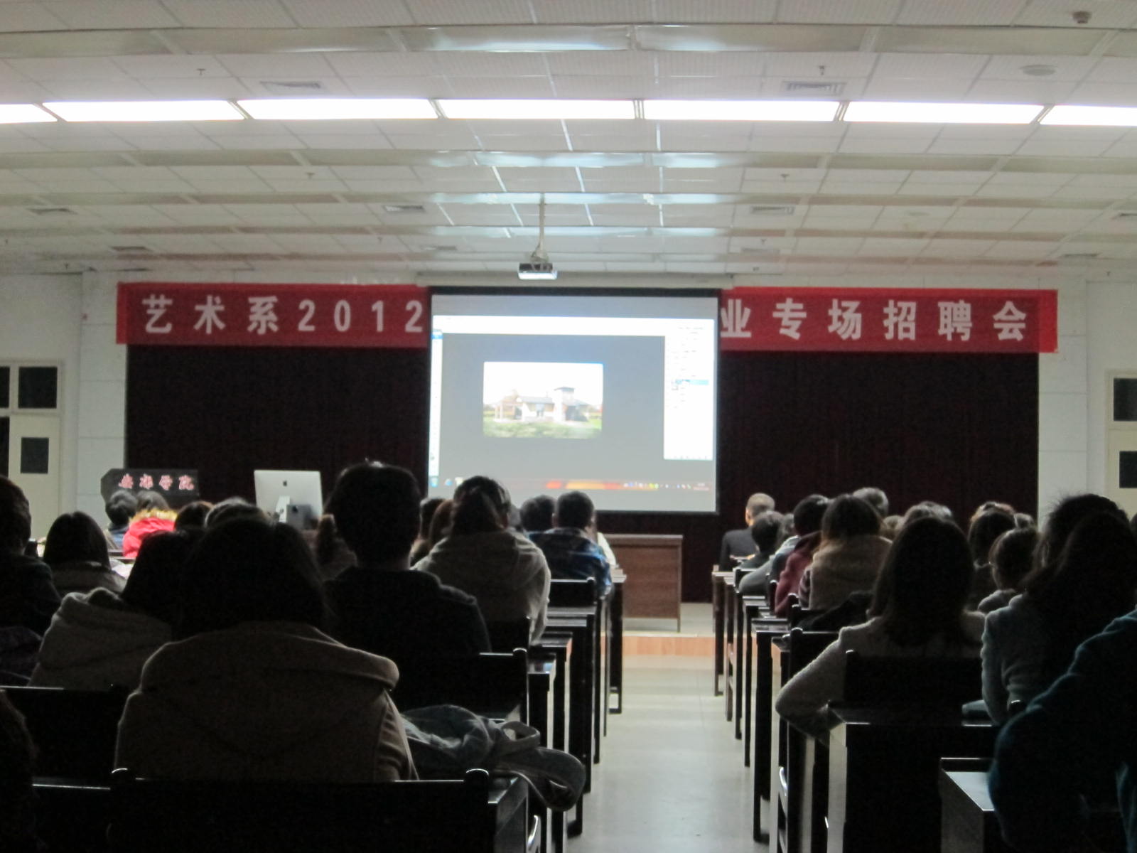 四是有计划地鼓励和组织学生参加校内外的各种人才招聘活动。11月18日晚系上在图书馆六楼报告厅组织了专场人才招聘会,系党总支书记冯丰收主持,冯书记首先向用人单位介绍了我系发展概况和人才培养方向,同时要求2012届毕业生做好个人简历和个人特长介绍。积极向用人单位推介自己,力争尽快找到自己称心的工作。欢迎与艺术系建立良好合作关系的单位领导和技术骨干常来系上做客,为艺术系专业发展多提意见。