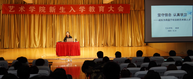 为进一步引导新生坚定理想信念,树立远大目标,提升艺术素养,12月8日晚,Beat365中文官方网站在1401教室开展了《坚守信念 认真学习-成长为有益于社会的艺术类人才》专题讲座。讲座由Beat365官网副院长鲍丽主讲,新生辅导员孟莉主持,2021级全体新生聆听了讲座。