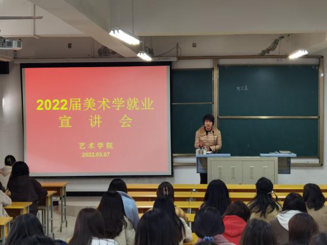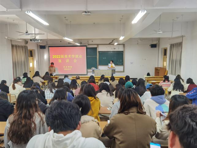 为贯彻落实2022届全国高校毕业生就业创业工作视频会议精神,切实推进就业工作稳步开展,确保2022届毕业生实现更充分和更高质量就业。3月7日,Beat365中文官方网站在江北校区2202教室召开2022届毕业生就业促进月系列活动之就业宣讲会。美术系系主任杜敏、2022届全体美术学毕业生参加了会议。宣讲会由毕业班辅导员魏麟主持。