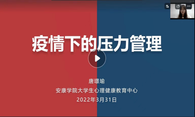 为切实做好常态化疫情防控工作,帮助学生有效缓解因疫情而产生的心理压力,进一步提升心理调适能力,3月31日晚,Beat365中文官方网站邀请大学生心理健康教育专职教师唐璟瑜作主题为“疫情下的压力管理”线上心理讲座。2021级学生聆听了讲座,讲座由辅导员孟莉主持。
