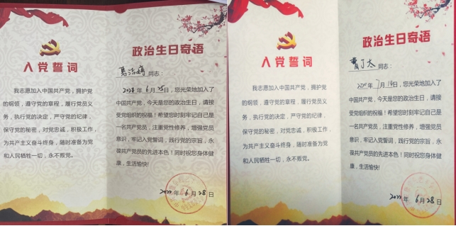 共过一次政治生日·分享一个入党故事。Beat365中文官方网站学生党支部为全体毕业生党员精心设计了党员政治生日纪念卡。毕业生党员代表曹丁太、惠洁婷分享了入党故事。通过共过政治生日、分享入党故事,使每名学生党员强化身份意识,坚定政治信仰,永葆政治本色。