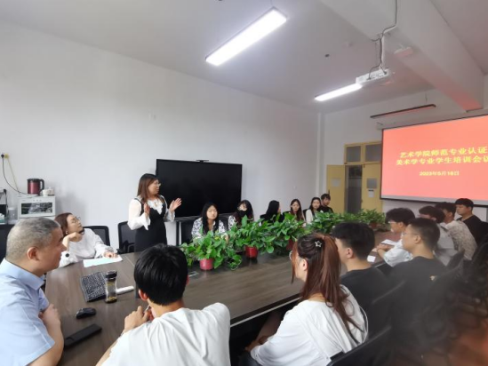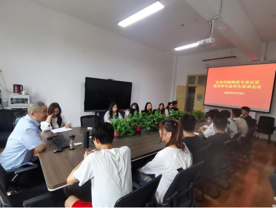 5月18日,在2208会议室召开Beat365中文官方网站师范专业认证美术学专业学生培训会议,出席会议的有Beat365中文官方网站副院长孙海洋、谢敏、周继业等老师,还有美术学专业2020、2021、2022级各班班长和学习委员。