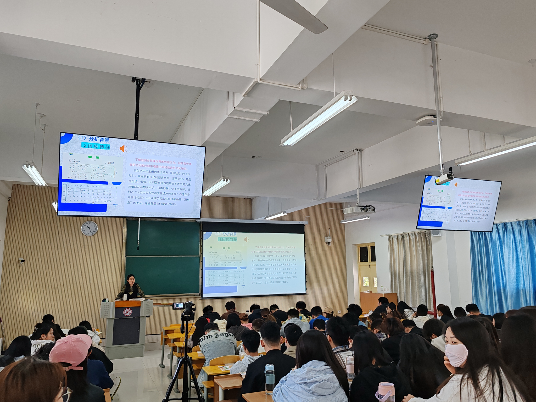 在授课的过程中,刘老师结合自己多年的教学经验和实例,详细讲解了如何对音乐教材进行分析,她从教材分析的背景和结构出发,引导学生们理解音乐教材编写的原则、目的和特点。她指出在分析教材时要关注教材的内在逻辑和教学内容的安排,以及教材与学生实际需求的契合度。