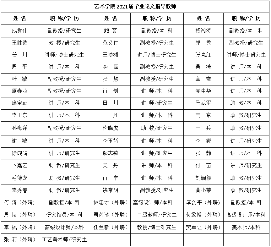 指导教师的聘任资格:具有中级以上专业技术职称或研究生学历的教师均可。助教一般不能单独指导毕业论文,为培养年轻教师,具有助教职称的教师可以和副教授以上人员组成小组联合指导,可与校外行业专家联合指导。每位教师指导人数原则上不超过8人。