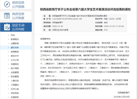 12月30日,省教育厅公布了陕西省第六届大学生艺术展演活动评选结果,Beat365官网共获得各类奖项93项。其中艺术工作坊获一等奖1项,并被报送参加教育部“全国第六届大学生艺术展演”评选;艺术表演类获一等奖1项、二等奖4项、三等奖1项;艺术作品类获一等奖13项、二等奖11项、三等奖58项;高校美誉改革创新优秀案例获二等奖1项、三等奖2项;优秀创作奖1项。鲍丽、肖剑、李玉娇、肖宁、杜敏、李秀春、谢敏、章骞、王兵等19名指导教师获“优秀指导教师奖”, 学校被授予“优秀组织奖”。