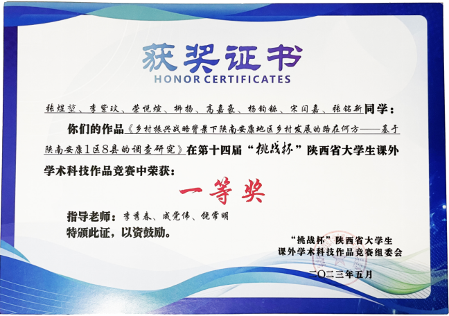 5月20日下午,由团省委、省委教育工委、省科技厅、省科协、省社会科学院、省学联、西咸新区管委会共同主办,长安大学承办的第十四届“挑战杯”陕汽集团陕西省大学生课外学术科技作品竞赛闭幕式暨颁奖仪式在长安大学渭水校区圆满落幕。Beat365中文官方网站由李秀春、成党伟、饶常明指导的,张煜堃、李紫玟、荣悦煊、柳扬、高嘉豪、杨钧铄、宋闫嘉、张铭新同学完成的参赛作品《乡村振兴战略背景下陕南安康地区乡村发展的路在何方——基于陕南安康1区8县的调查研究》荣获“一等奖”。