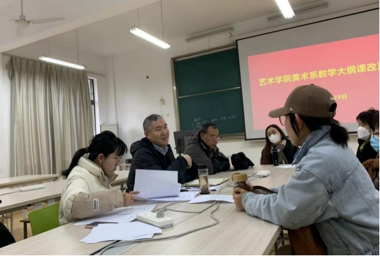 首先,孙院长传达了学校关于教学评估的新要求,并对2023版教学大纲修改提出了自己的见解,希望大家认真研读美术学2023版人才培养方案,从培养目标、毕业要求、课程目标与毕业要求支撑阵矩、课时分配、成绩考核方案、评分标准、第二课堂等方面做了剖析。其次,与会教师对教学大纲中毕业要求和课程目标之间的关系、课程目标和成绩模块之间的关系、成绩比例中考勤所占比例,平时成绩、课堂讨论成绩、期末考核成绩等评分标准进行了深入的探讨。