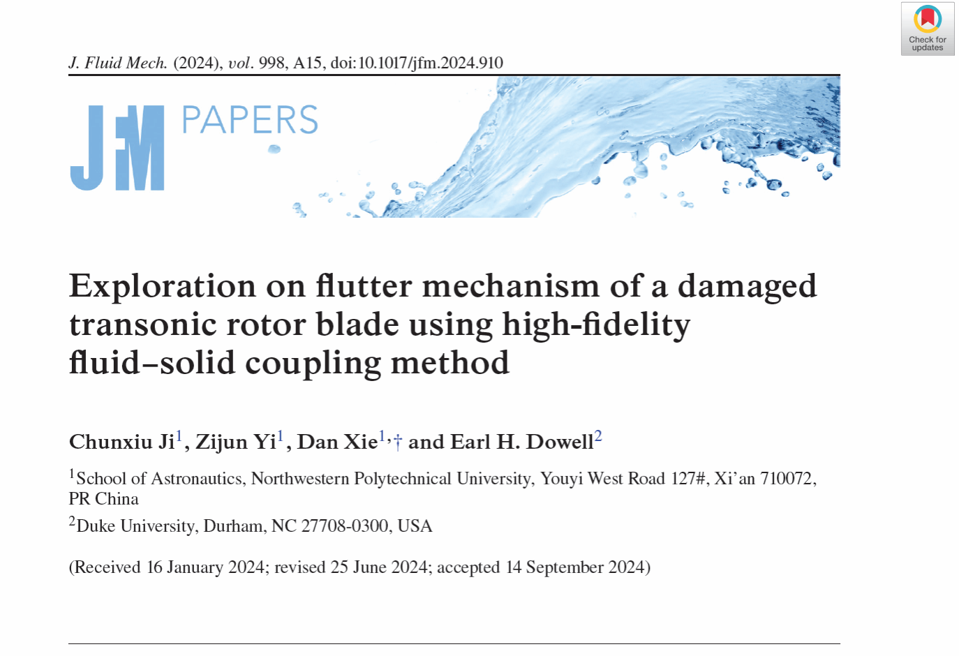 近日,beat365亚洲版官网谢丹教授团队在发动机转子损伤叶片颤振机理研究上取得重要进展。研究成果以“Exploration on flutter mechanism of a damaged transonic rotor blade using high-fidelity fluid–solid coupling method”为题发表在由英国剑桥大学George K. Batchelor创办的流体力学国际顶级期刊《Journal of Fluid Mechanics》上(https://doi.org/10.1017/jfm.2024.910)。谢丹教授是论文的唯一通讯作者,博士生冀春秀为第一作者,杜克大学Dowell教授为合作者。该研究得到了国家自然科学基金面上项目、国家自然科学基金国际(地区)合作交流项目资助。
