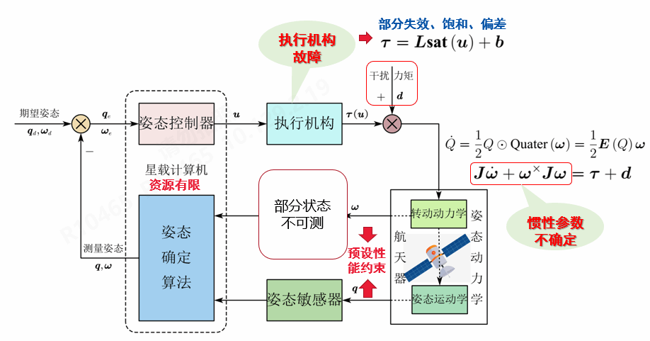 本论文依托beat365亚洲版官网空间操作技术研究所航天飞行动力学技术国家级重点实验室,面向国家航天领域重大需求开展研究,主要针对在轨服务任务中普遍存在的惯性参数不确定、未知动态干扰、执行机构故障、部分状态不可测和全状态运动约束等问题,考虑实际工程中航天器有限的燃料能源和计算资源等条件限制下,基于自适应控制方法,开展具有渐近收敛特性的航天器姿态跟踪自适应理论、方法研究(图2)。主要的研究内容和成果可以概括为以下几个方面: